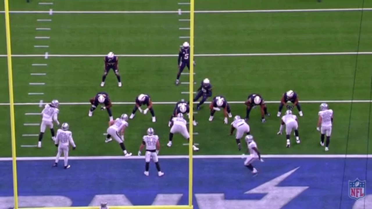 Raider ball at 23yrd line. Raiders run right from shotgun formation with excellent pulling and blocking. Tillery playing from Bosa's position hjas a chance to make the stop for a loss. Davis slid inside to cover the TE and got caught in wash. Jenkins does not recognize the play until the RB is outside the hash marks and gaining speed to get outside the numbers. Adderly looks like he expects someone else to make the play and jogs across the field.
