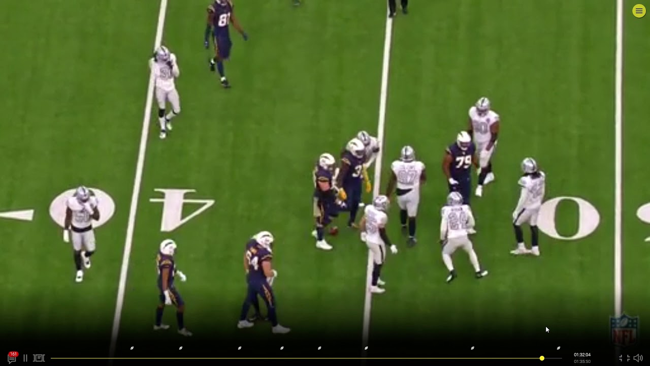 Allen motions all over the place. It looks like he is double teamed or maybe the LVR cb makes a good adjustment. There is no room and everyone is covered. Tyrod tries his best to make a play but there is nothing there. He did have a small widow to hit Guyton scrambling in the end zone. Knowing Guyton will try to make something of nothing lessens the sting a little. Maybe, just maybe in future he will.